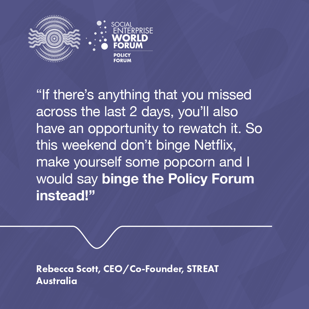SEWF will continue to strive for diverse representation across all our events and especially when it comes to highlighting examples of policy innovation. We believe this is critical to provide the kind of learning and inspiration this Policy Forum was designed to showcase. We want all those who participate to leave feeling inspired like a participant from Australia who shared their favourite part of the Policy Forum was: